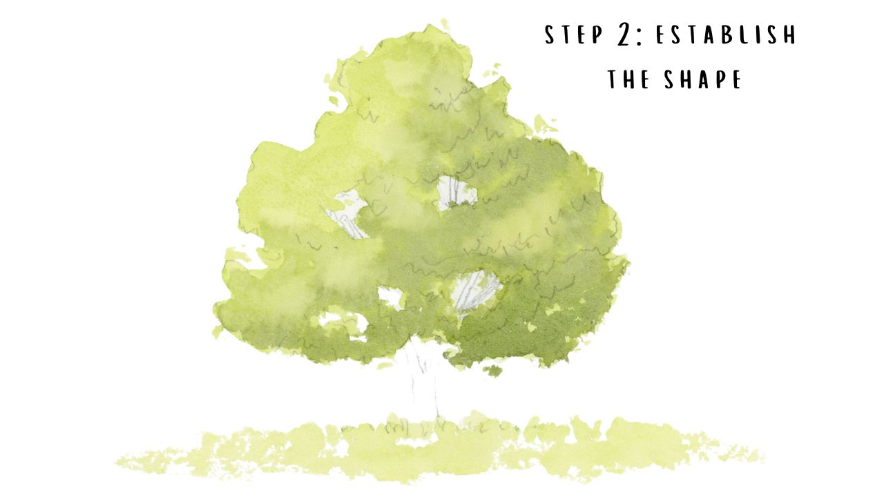 Then, go back to your lighter value and add a few tiny dots to the edge of your tree to represent loose leaves; this helps break up the edge so the foliage doesn’t feel like a static, solid object. Still using the light green color, paint the grass below the tree, leaving some gaps in the wash. Let everything dry fully before moving on.