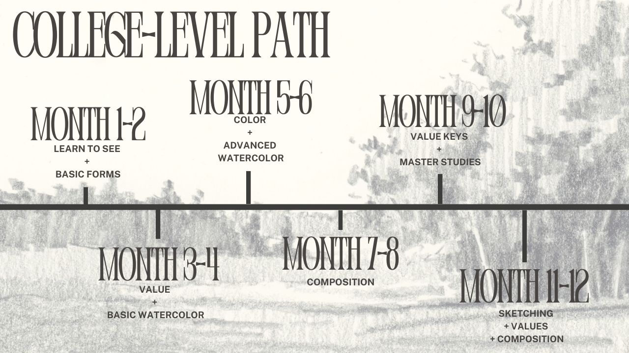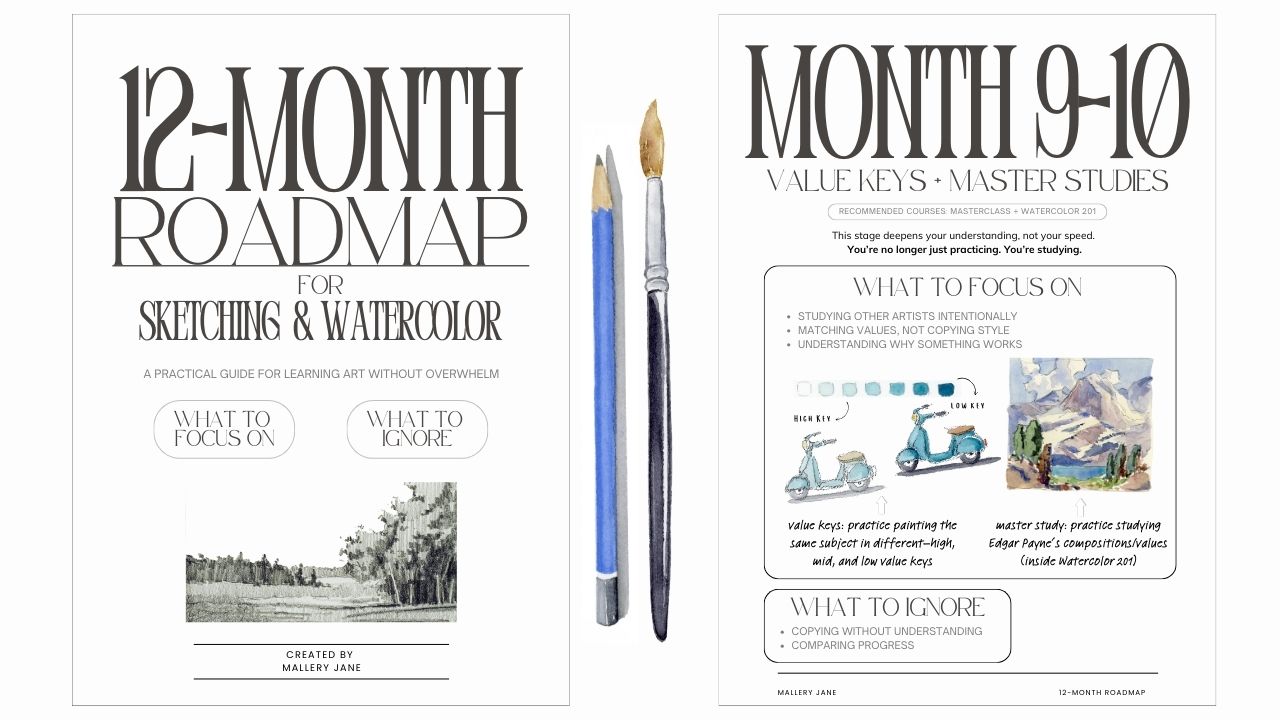 - The exact skills to focus on every two months (sketching, value, color, composition, and more)